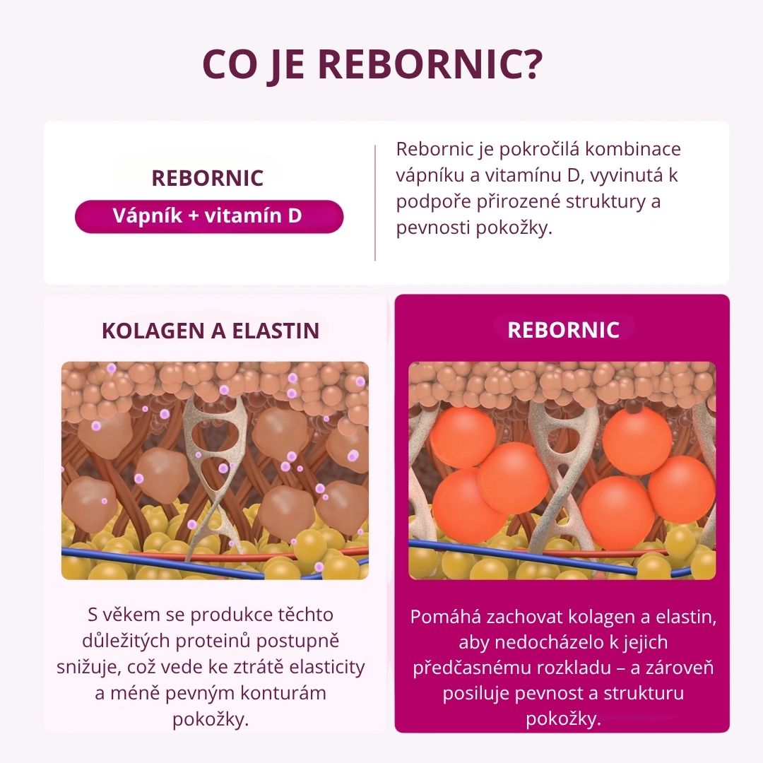 Komplex Rebornic™ s vápníkem posiluje strukturu pleti a zlepšuje elasticitu, takže kontury jsou pevnější a výraznější.